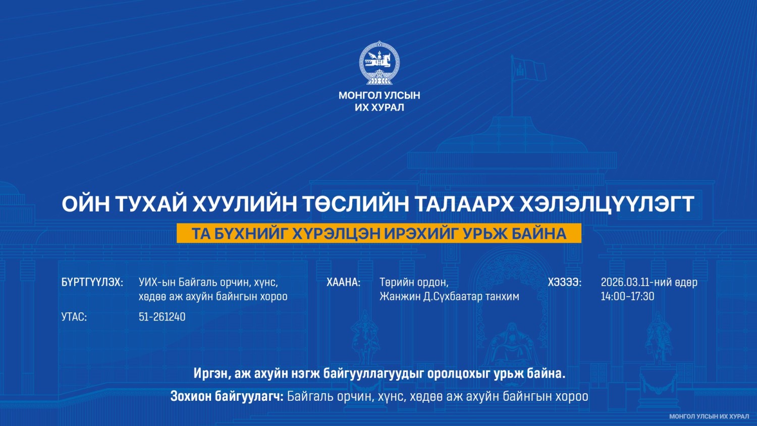 Ойн тухай хуулийн төслийн хэлэлцүүлэгт оролцохыг урьж байна