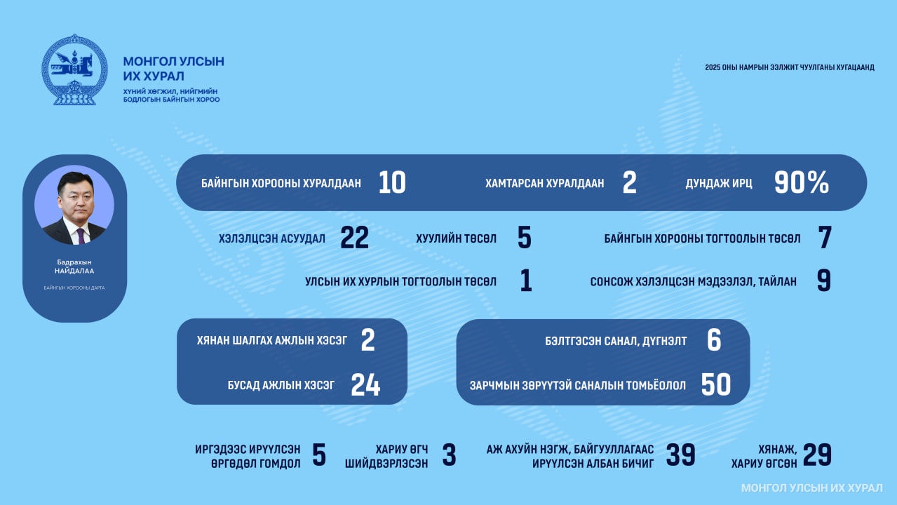 Улсын Их Хурлын Хүний хөгжил, нийгмийн бодлогын байнгын хороо 2025 оны намрын ээлжит чуулганы хугацаанд буюу 2025 оны есдүгээр сарын 15-ны өдрөөс 12 дугаар сарын 31-ны хооронд бие даасан 10, хамтарсан хоёр хуралдаан хийж, нийт 22 асуудал хэлэлцжээ. Үүний дотор Шинжлэх ухаан, технологийн тухай хуульд нэмэлт, өөрчлөлт оруулах тухай, Тамхины хяналтын тухай хуульд нэмэлт, өөрчлөлт оруулах тухай зэрэг хуулийн таван төсөл, Улсын Их Хурлын тогтоолын нэг, Байнгын хорооны тогтоолыг долоон төсөл хэлэлцсэн байна.