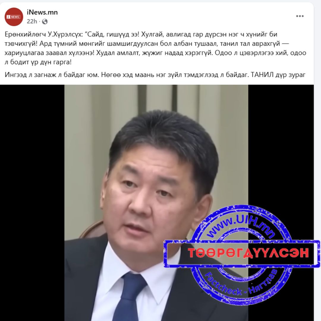 Үүнийг ихэнх хүмүүс Ерөнхийлөгч өчигдөр сайд нарыг дуудаж уулзахдаа хэлсэн үг гэж ойлгосон. Гэвч тус видео бичлэг нь 2022 оны 12-р сарын 07-ны өдөр INews пэйж хуудаст нийтлэгдсэн Ерөнхийлөгч У.Хүрэлсүх тухайн үеийн Засгийн газрын Хэрэг эрхлэх газрын дарга Д.Амарбаясгалан, Хууль зүй, дотоод хэргийн сайд Х.Нямбаатар, Зэвсэгт хүчний Жанжин штабын дарга, бригадын генерал С.Ганбямба, Монгол Улсын Ерөнхий прокурор Б.Жаргалсайхан, Тагнуулын ерөнхий газрын дарга, хошууч генерал П.Одонбаатар, Авлигатай тэмцэх газрын дэд дарга, эрхэлсэн комиссар Г.Азжаргал, Цагдаагийн ерөнхий газрын дарга, хошууч генерал Ж.Болд нарыг дуудаж уулзсан үеийн бичлэг байна.
