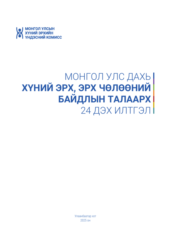 Комисс Монгол Улс дахь хүний эрх, эрх чөлөөний байдлын талаарх 24 дэх илтгэлийг “Сонгох, сонгогдох эрх: 2024 оны сонгуулийн үйл ажиллагаа”, “Хүний эрх хамгаалагч өмгөөлөгч, сэтгүүлчийн өнөөгийн нөхцөл байдал”, “Хүний эрх ба цахим технологи”, “Цахим технологи ашиглан үйлдэгдэж буй жендэрт суурилсан хүчирхийлэл”, “Эрүүгийн хэрэг хянан шийдвэрлэх ажиллагаан дахь бэлгийн хүчирхийллийн хохирогч хүүхдийн эрхийн зарим асуудал” “Шударгаар шүүлгэх эрхийн хэрэгжилт” гэсэн 6 бүлгийн хүрээнд боловсрууллаа.